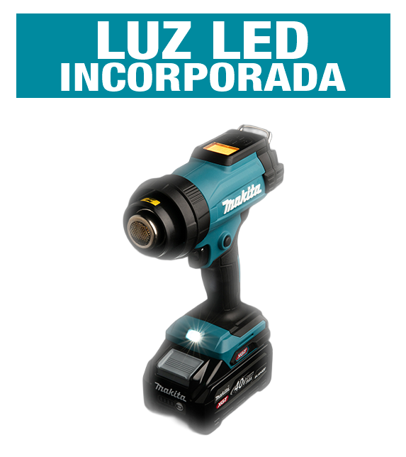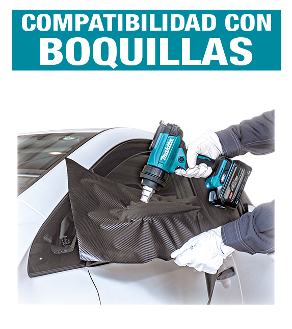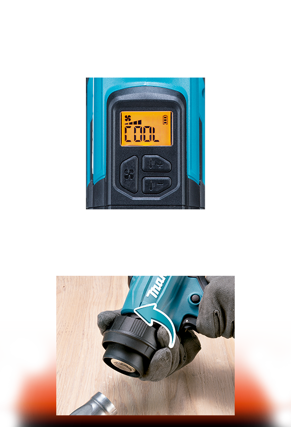 La pantalla LCD retroiluminada permite ajustar con precisión la temperatura y el flujo de aire, mostrando el nivel de batería y avisos de seguridad, mientras que el cambio rápido de boquillas sin herramientas y el bloqueo para uso continuo facilitan el trabajo en aplicaciones prolongadas.