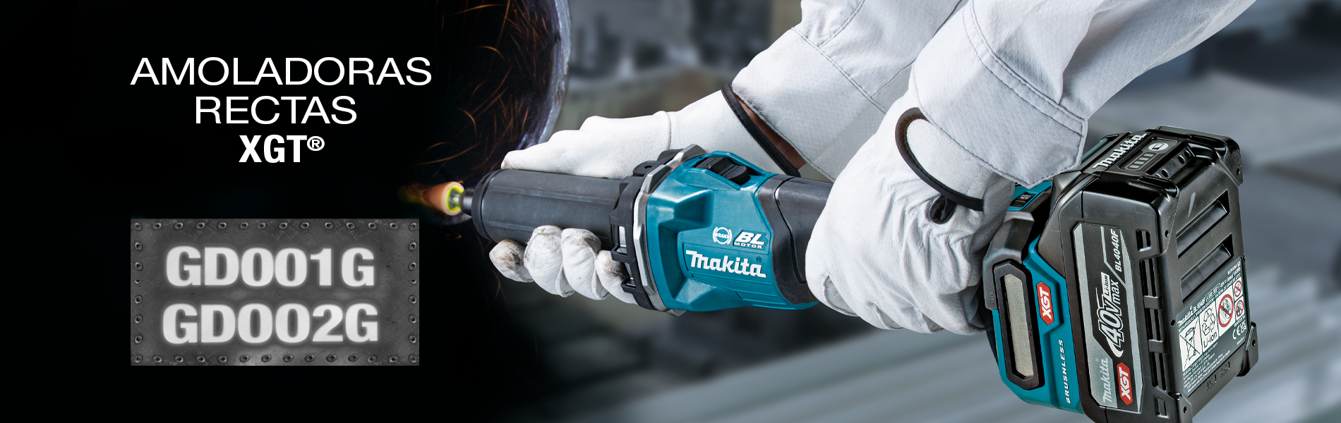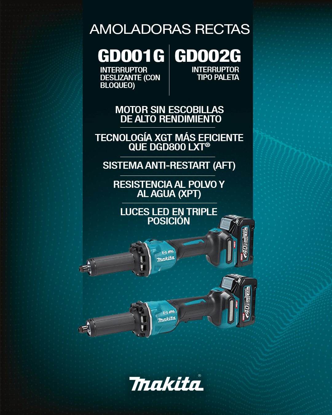 Las amoladoras rectas GD001G y GD002G están equipadas con motor sin escobillas, una pinza de 6mm y tecnología XPT, diseñadas para mejorar la resistencia al polvo y al agua. Además, tienen 3 luces LEDs que optimizan la visibilidad en espacios reducidos.