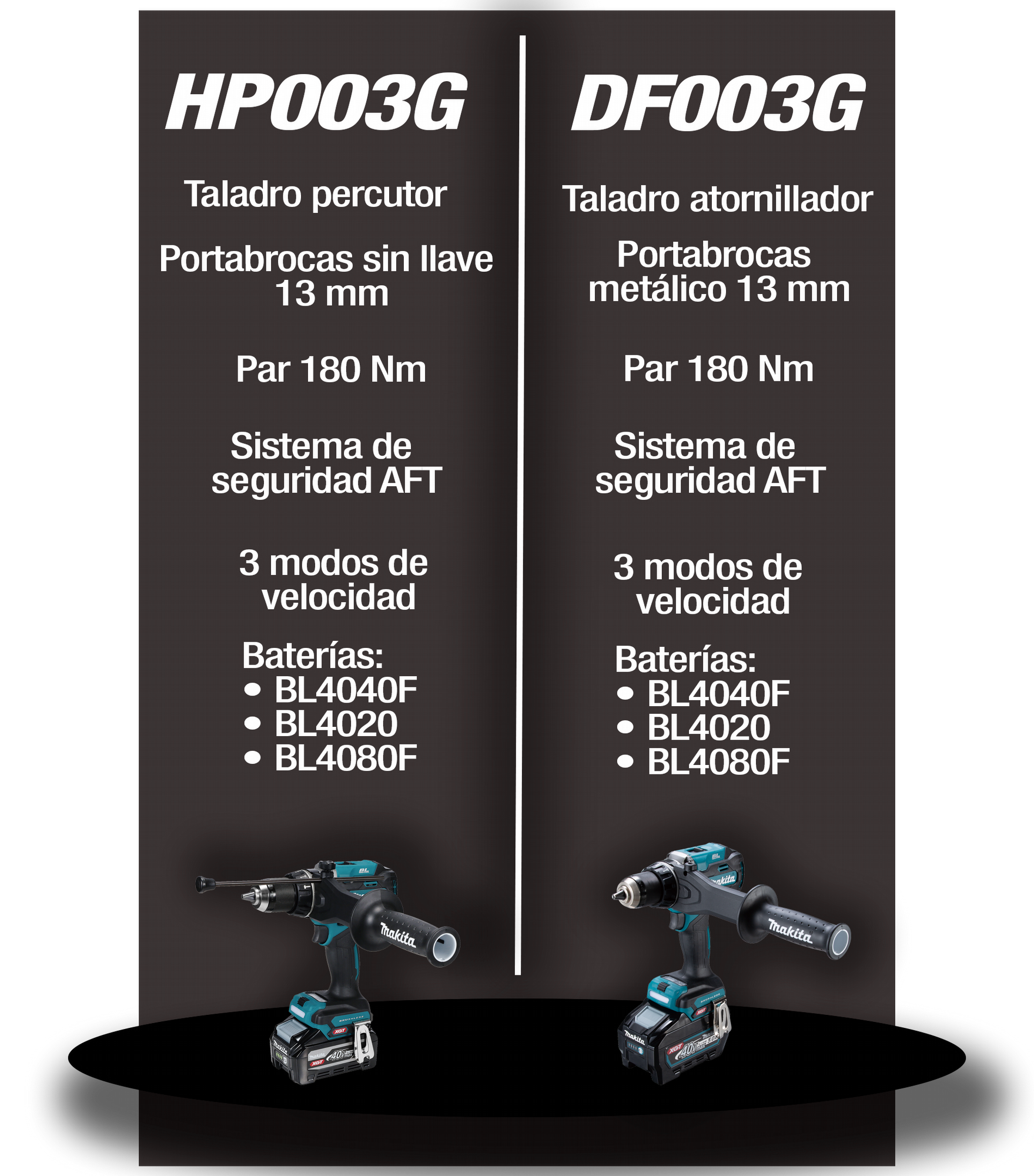 Los HP003G y DF003G XGT® 40Vmax combinan alto par, control total y máxima seguridad para los trabajos más exigentes. Con motor sin escobillas, portabrocas metálico de 13 mm y tecnología AFT, ofrecen un rendimiento fiable y preciso en perforación y atornillado intensivo.