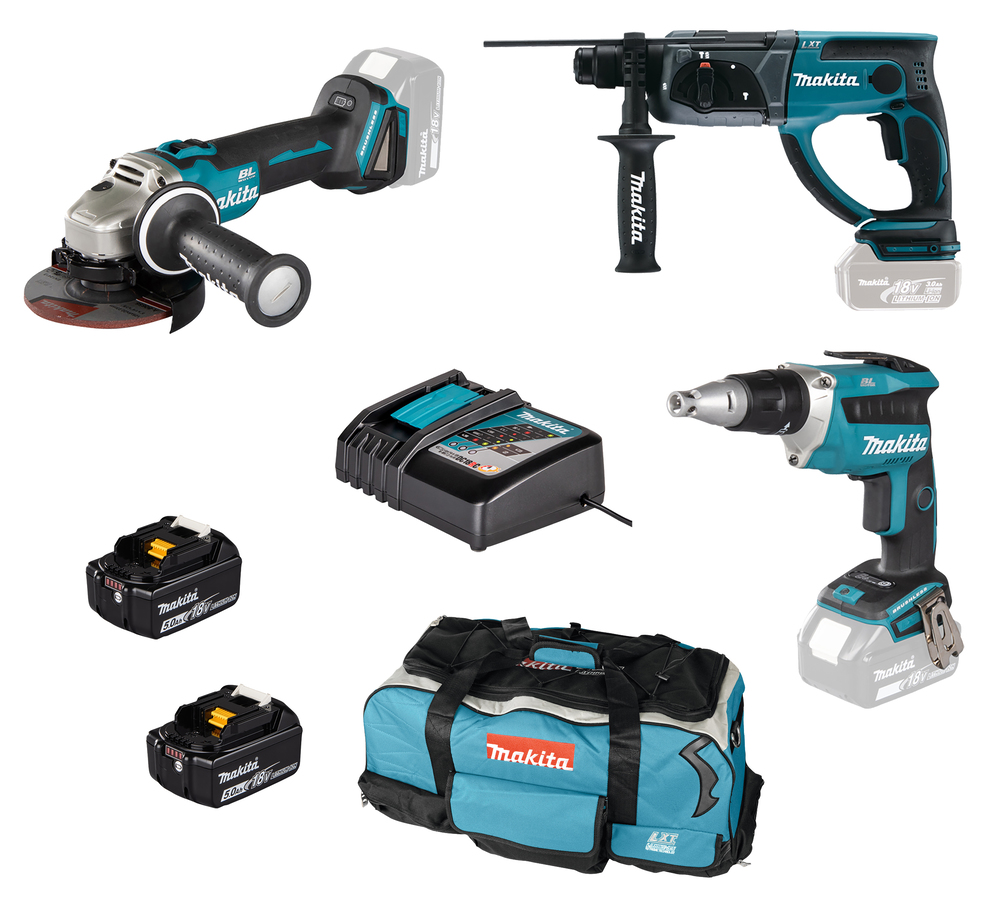 Combo compuesto por un martillo perforador, un atornillador para placas de yeso y una amoladora angular. Incluye dos baterías de 5,0 Ah y un cargador rápido. Se entrega en una práctica bolsa para herramientas.