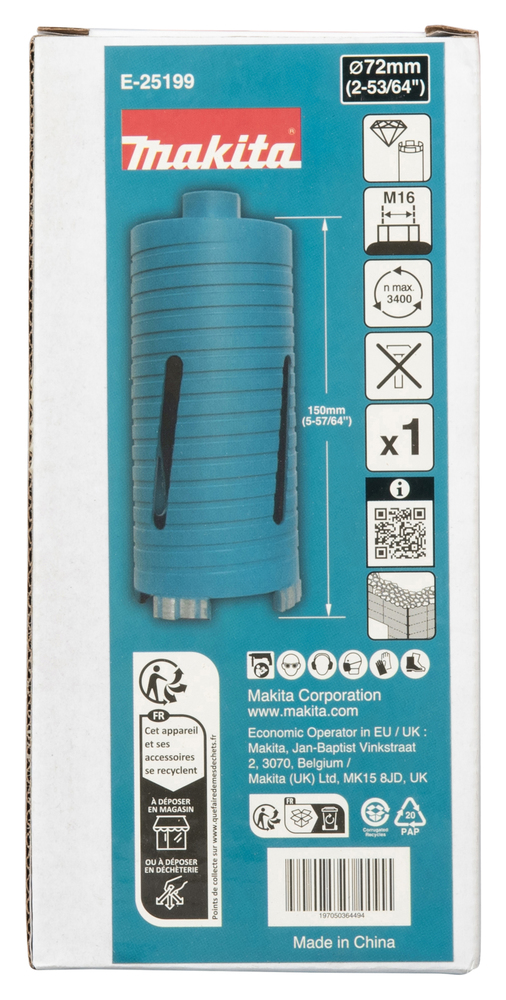 Broca de diamante con un diámetro de 72 mm, una longitud total de 150 mm y un vástago M16. La punta afilada y la unión por soldadura láser permiten un taladrado rápido y duradero. Las ranuras en forma de espiral en el lateral descargan las virutas de manera eficiente.