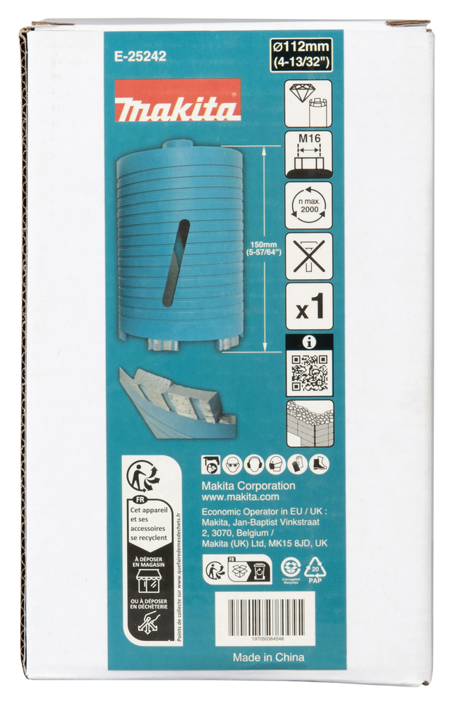 Broca de diamante con un diámetro de 112 mm, una longitud total de 150 mm y un vástago M16. La punta afilada y la unión por soldadura láser permiten un taladrado rápido y duradero. Las ranuras en forma de espiral en el lateral descargan las virutas de manera eficiente.