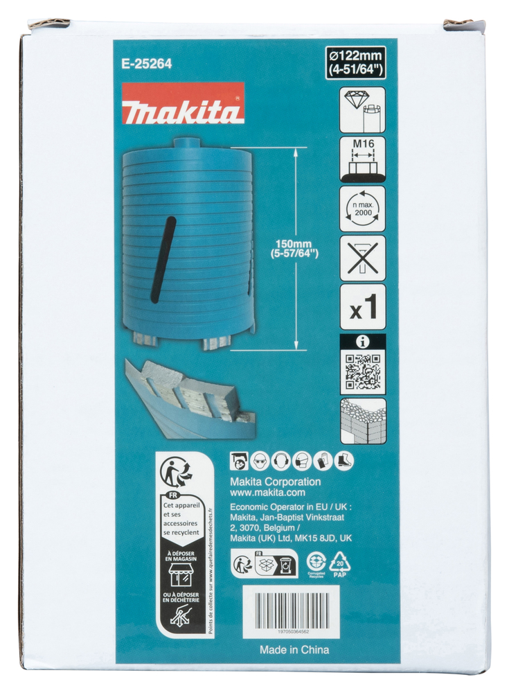 Broca de diamante con un diámetro de 122 mm, una longitud total de 150 mm y un vástago M16. La punta afilada y la unión por soldadura láser permiten un taladrado rápido y duradero. Las ranuras en forma de espiral en el lateral descargan las virutas de manera eficiente.